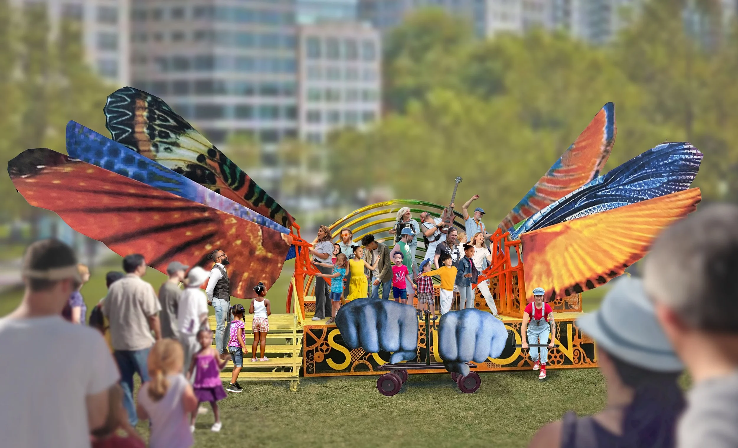 In the show’s finale, Joy takes flight, propelled by the crew of volunteers rowing huge wings, wheeling and fluttering in unison, filling the civic space with collaborative and gregarious energy.